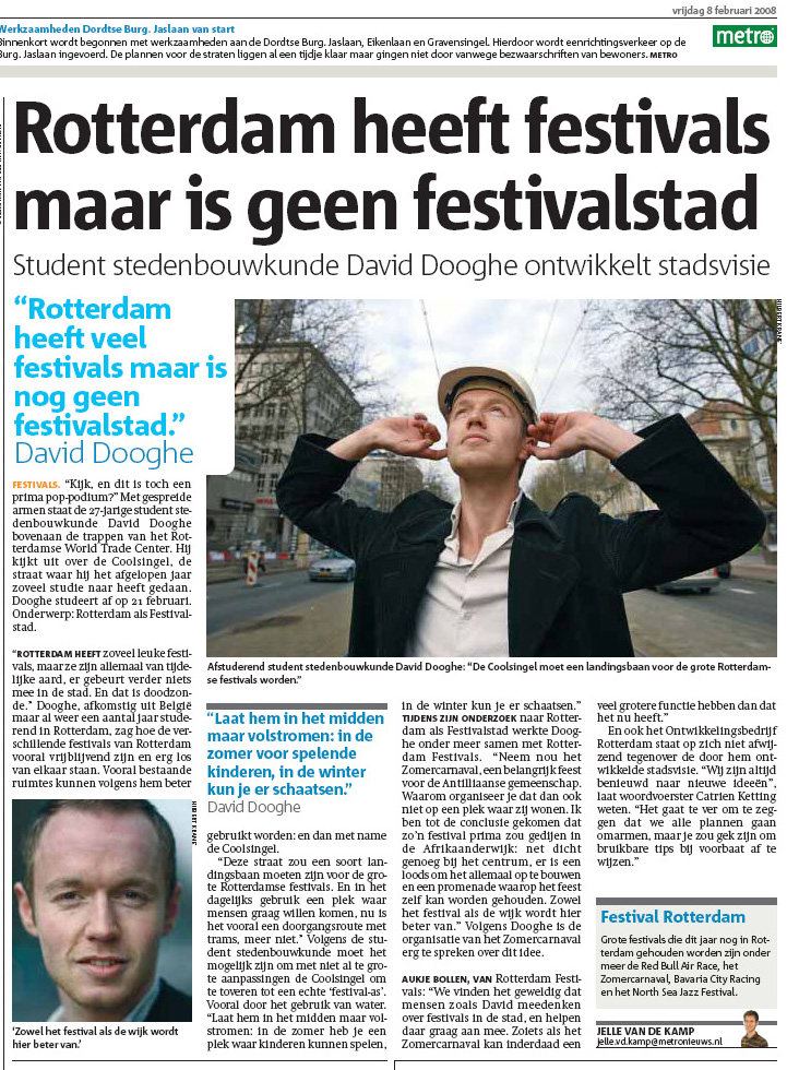 Interview with David Dooghe by newspaper Metro on project Festival City_Rottterdam and Rotterdam Urban Theatre.